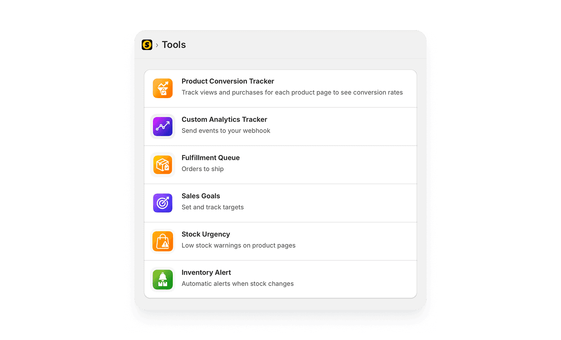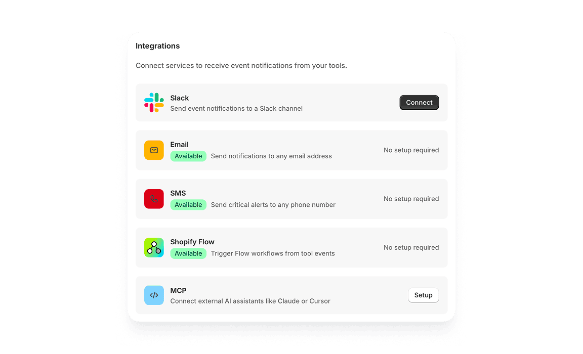Integrate your custom apps and automations with the tools you use everyday to always stay on top of your store.