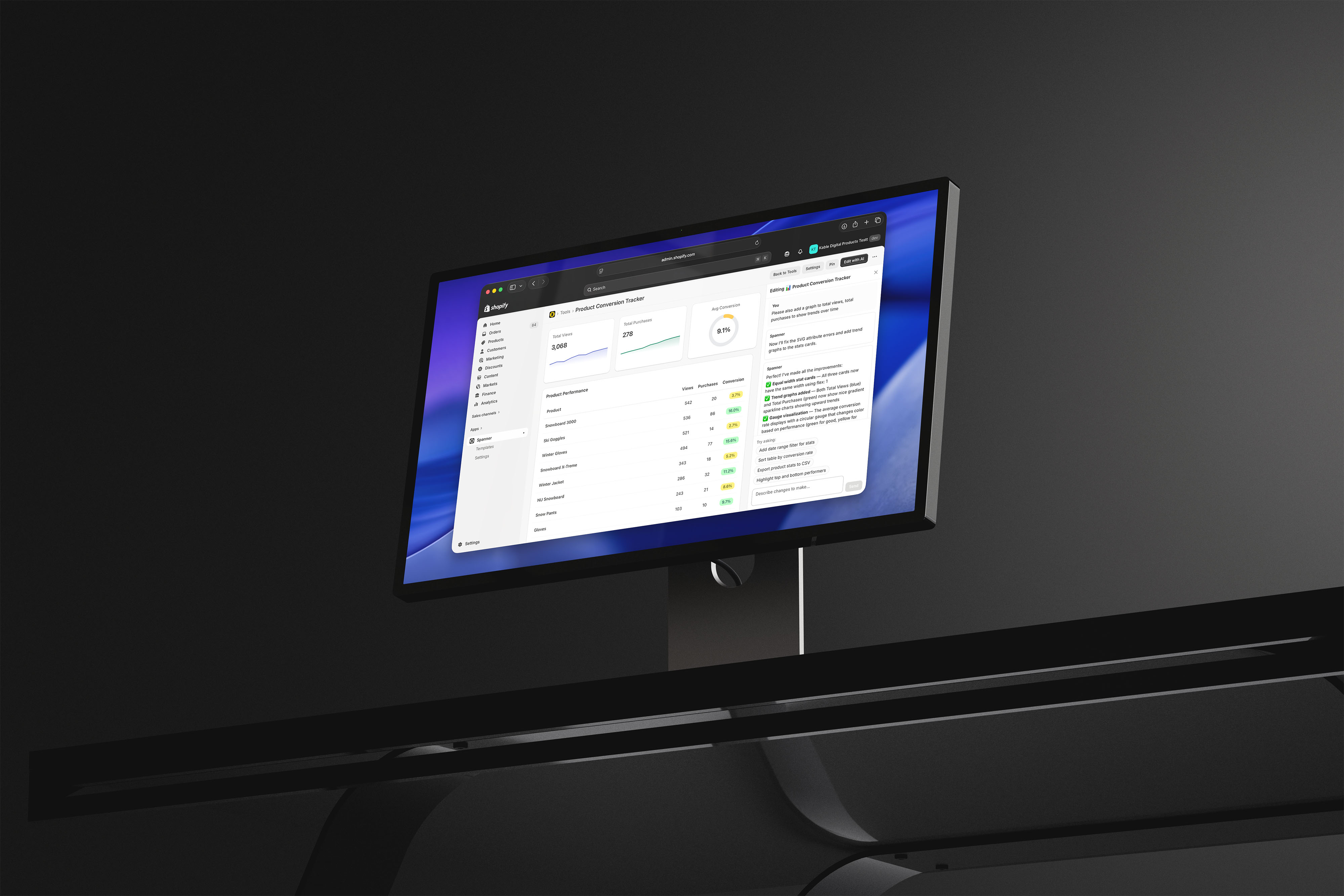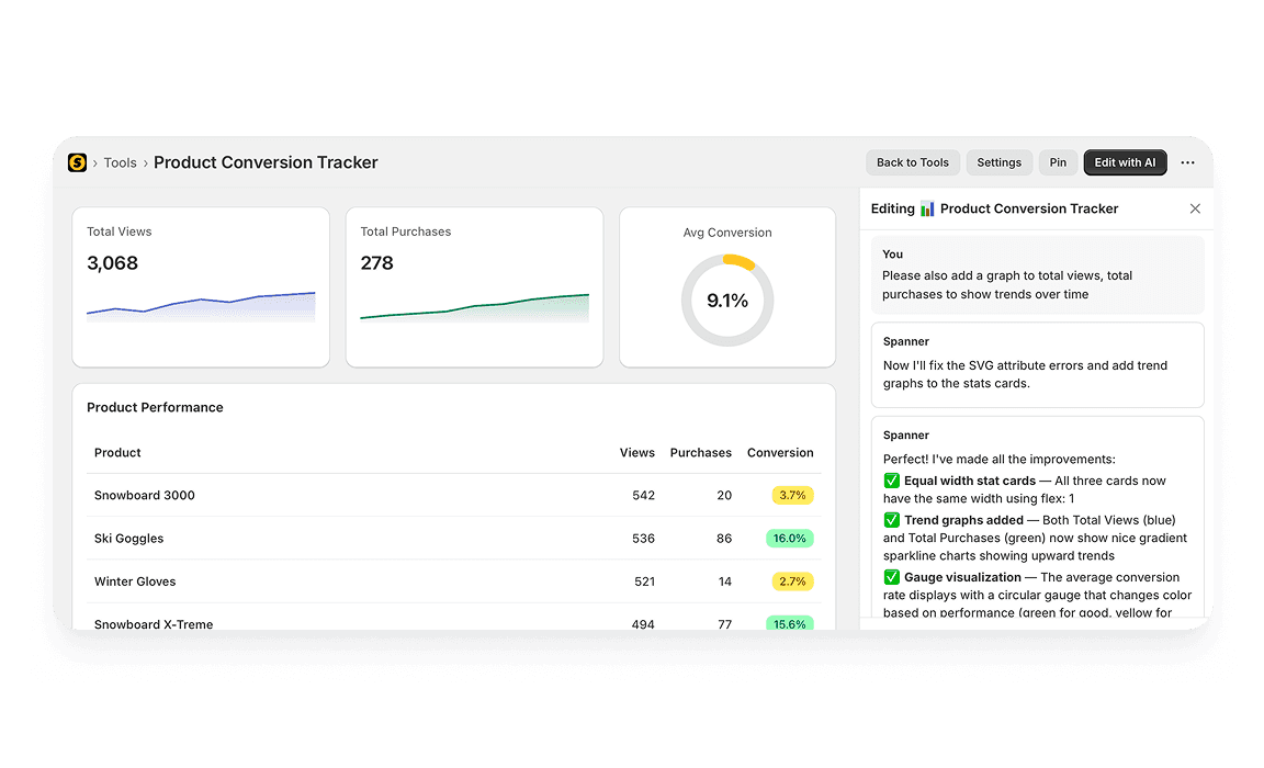 Spanner designs the UI around your request—dashboards, trackers, calculators, forms, or tools—automatically structured and styled.